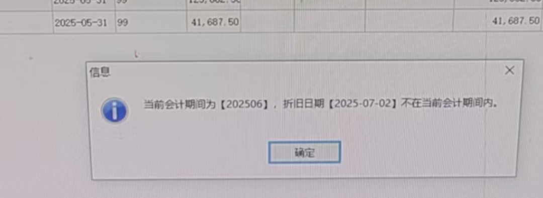 A:基礎資料——財務資料——會計期間,查看開賬期間設置在幾月份,固定資產(chǎn)入賬日期要在該期間所在日期前面。比如當前會計期間是6月份,那么需要改下登錄日期到6月份,再來進行折舊。